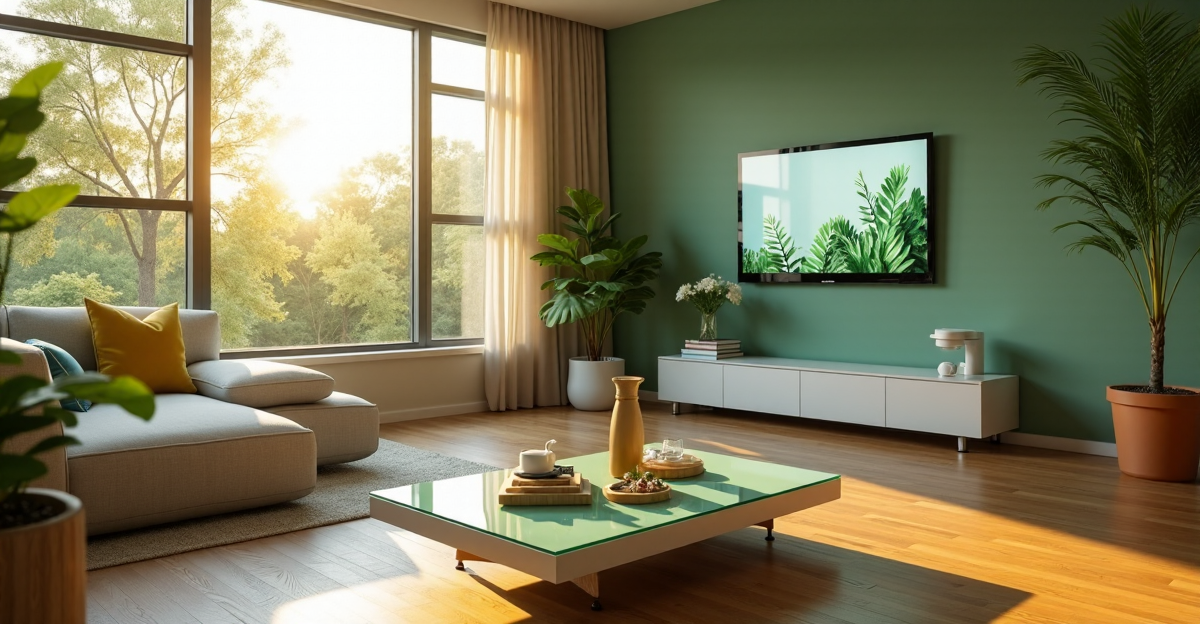 "A modern living room featuring cutting-edge green tech solutions, including solar panels, energy-harvesting floor, air purification system, and smart thermostat."