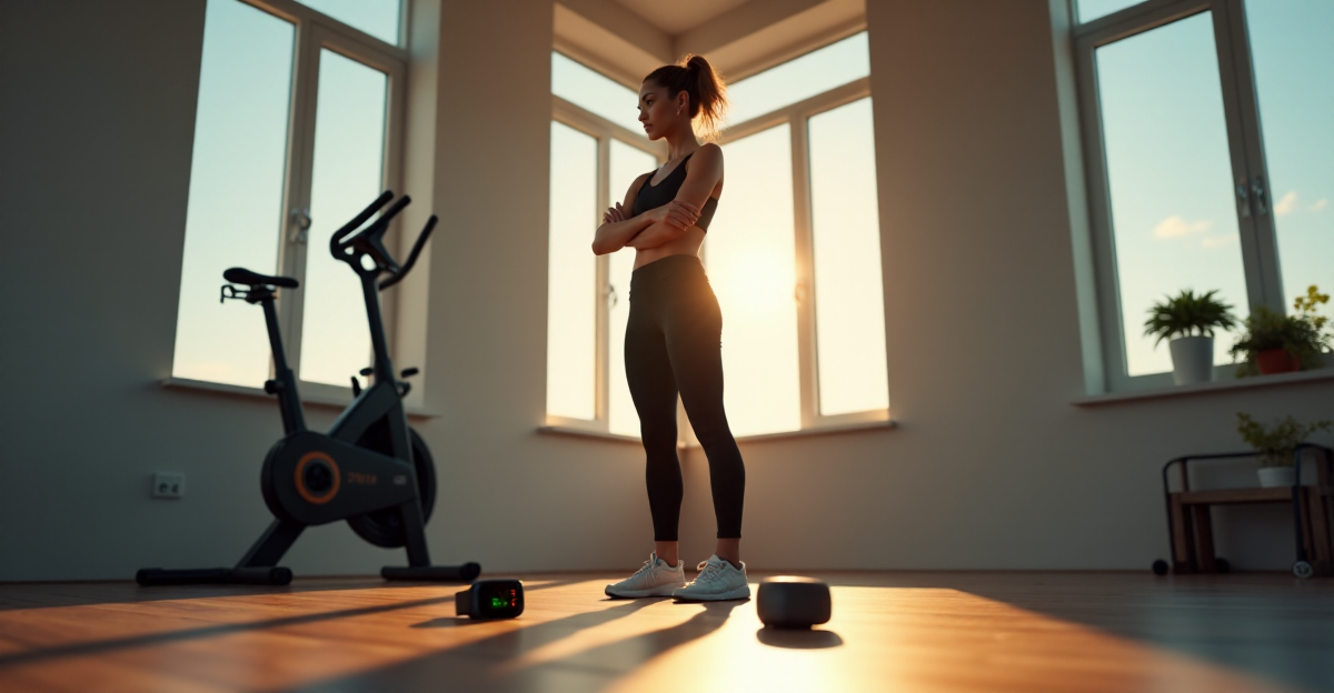 "A young woman stands confidently in a minimalist home gym surrounded by health and fitness tech gadgets, including a smartwatch and exercise bike, with natural light pouring in through large windows."