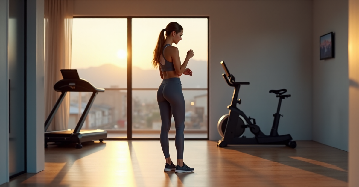 "A young woman stands confidently in a modern home gym surrounded by cutting-edge health fitness tech gadgets, wearing high-tech sports attire."