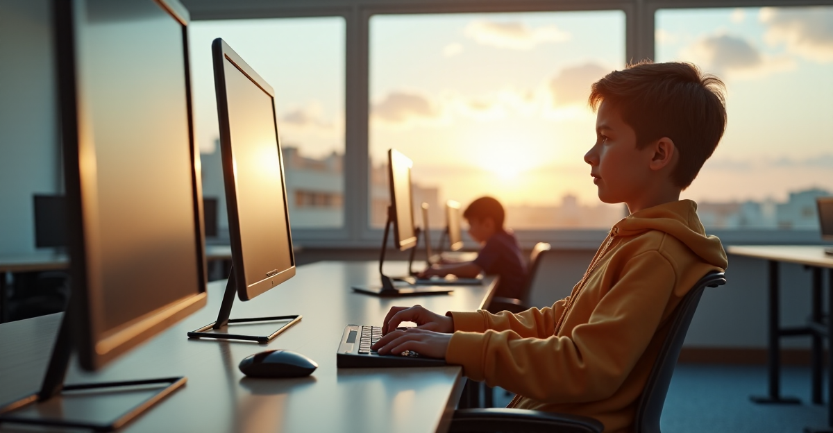 "A young student sits comfortably on a modern desk chair, surrounded by cutting-edge education technology tools in a well-lit, modern classroom."